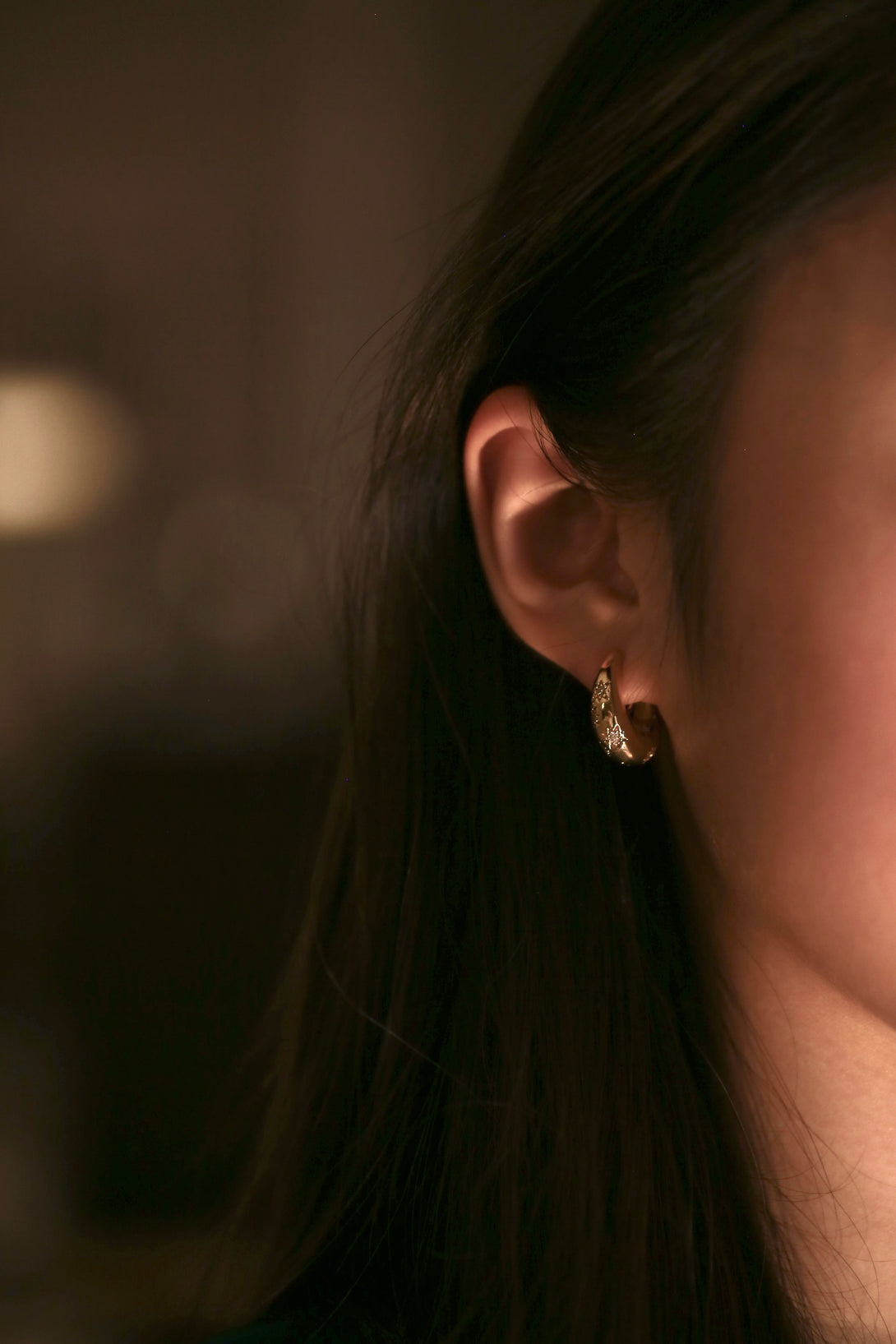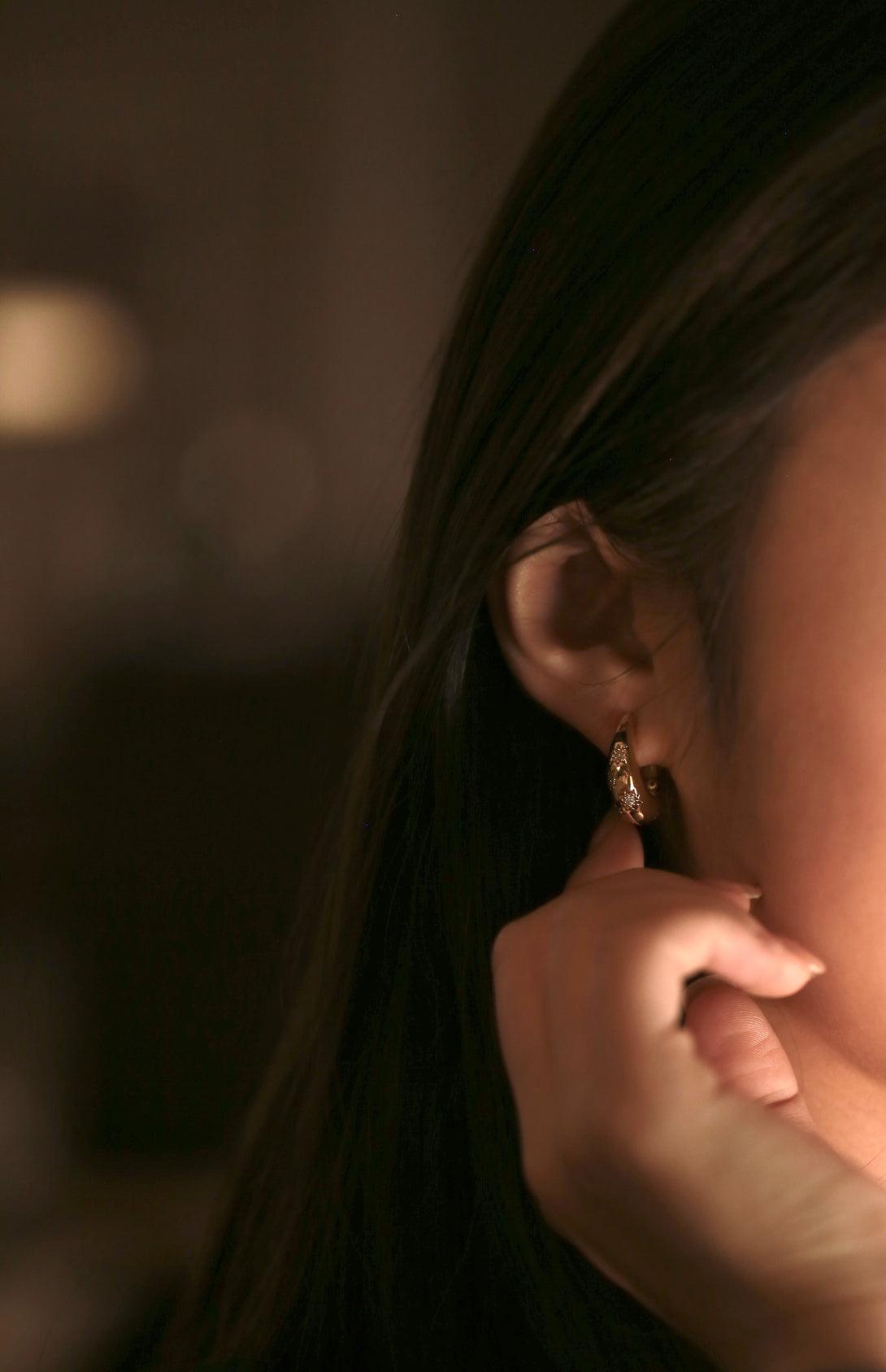 A modern classic with celestial charm. These gold croissant-shaped clip-ons glow with embedded star pavé detailing, merging Parisian volume with cosmic sparkle — bold yet refined.